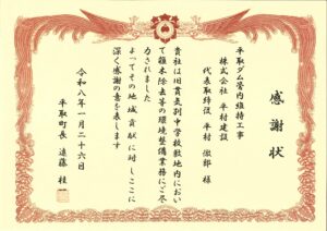 平取町から、本年度の平取ダム管内維持工事の際に行った地域貢献活動に関して感謝状をいただきました。 旧平取中学校敷地内で雑木を除去する等の環境整備活動を評価していただいたものです。 弊社では今後も地域に寄り添った活動を続け
