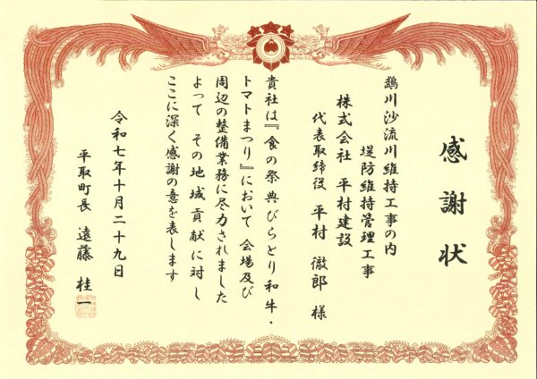 本年度の鵡川沙流川維持工事の中で実施した地域貢献活動につきまして、平取町から感謝状をいただきました。